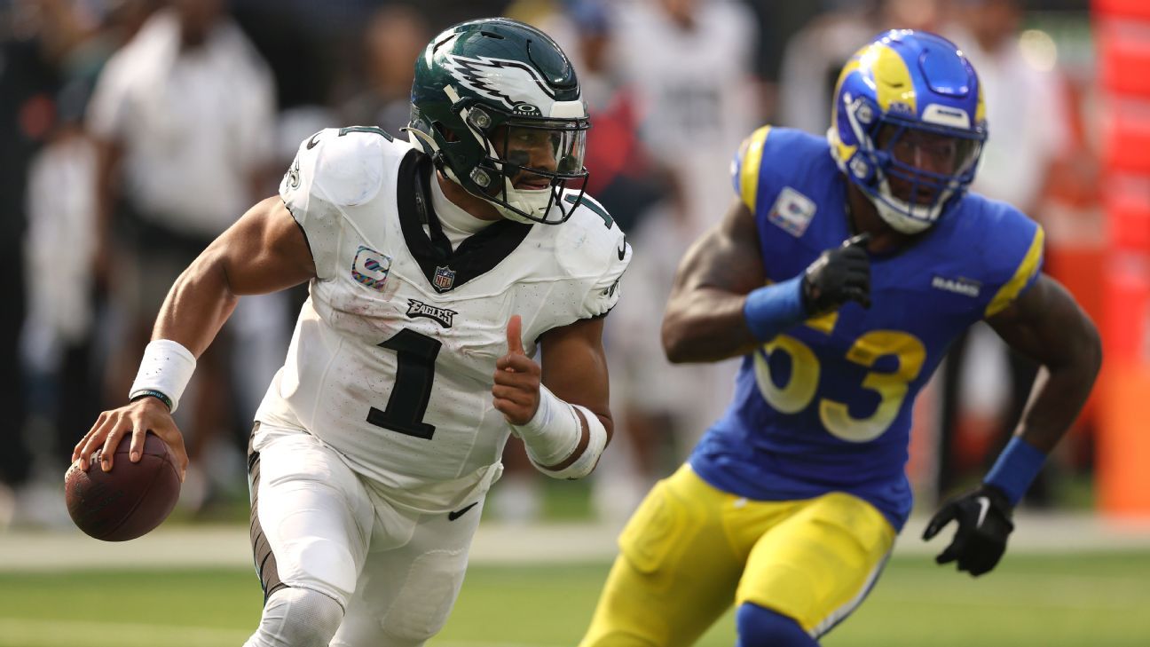 Los Angeles – Meio-campista Jalen Hurts estabeleceu os recordes da temporada em tentativas (15) e jardas (72) para levar o Philadelphia Eagles à vitória por 23-14 sobre o Los Angeles Rams no domingo.